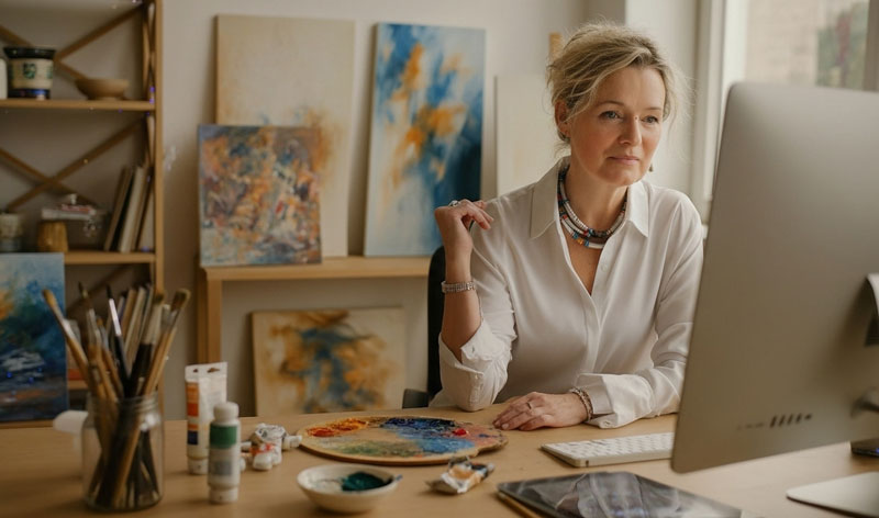 This framework takes shape through The Art Studio Residency. A private online studio designed for ongoing practice — where artists can return regularly, explore ideas, and develop their work within a thoughtful, structured environment. It brings together a live studio rhythm, a space for practice and conversation, and a curated reference structure for deeper development.