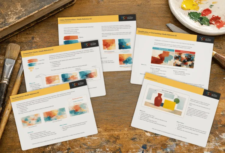 A printable set of studio reference cards designed to help you think through colour, composition, and painting decisions while you paint. Including famous painting examples and paint/brush recommendations.